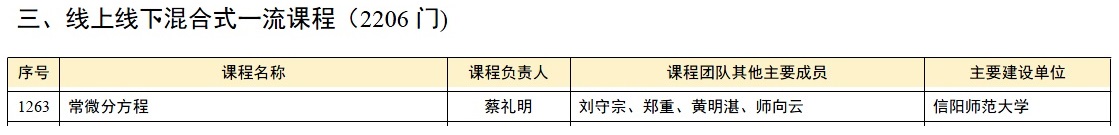 近日,教育部正式公布了第三批国家级一流本科课程认定结果公示名单,成人在线 成人在线 蔡礼明教授作为负责人的《常微分方程》课程入选“线上线下混合式一流课程”。