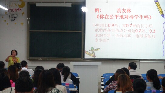 9月11日上午,应数学学院邀请,信阳市第一实验小学高级教师郝玲在数学学院104教室作了题为“今天的教师需要什么”的报告。“国培计划(2014)”――置换脱产研究项目和短期集中培训项目小学数学班全体学员聆听了报告,报告由班主任戴启学副教授主持。