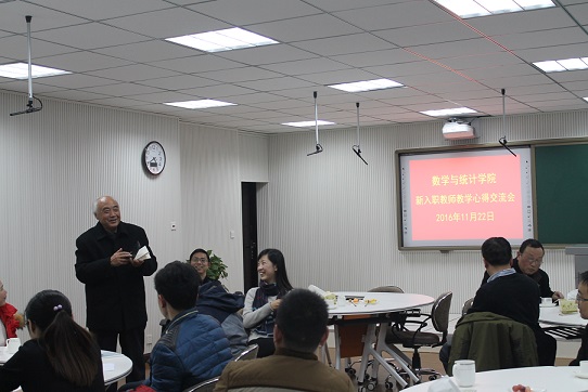 新入职教师首先结合自己近段时间的听课心得及目前在教学过程中遇到的困惑进行依次发言。郑重老师认为要注重和学生之间的交流和沟通,做好良师益友这一角色,并与其分享自己学习过程中的经验和方法,同时也希望以后多旁听优秀教师的课程来学习教学经验和技巧,不断地提高自身的综合技能,做到让学生满意,让自己满意。王莉老师谈到了如何激发学生学习兴趣、提高课堂教学的感染力等教学经验。王真老师提到应多关注学生的心理,育人先育心,引导学生有一个健康的心态。指导老师们认真聆听了新入职教师的发言,对他们认真探讨教学方法和辛勤教学育人表示赞许。秦金华教授表示很受启发,强调与学生换位思考,是做好老师的起点,以学生为主、讲课“接地气”是成为好老师的方法,并要认真传授思维过程,不断提高教学基本功,提高课堂教学感染力,依于教材而不拘于教材,培养学生的自主学习能力和创新素质。最后特邀嘉宾穆老师发言,他谈到教师应细心,耐心地指引学生学习,并要做到教学相长,互相学习,共同提高,同时将成为一名好老师视为不断追求并为之奋斗的目标。本次交流会在热烈的掌声中结束。