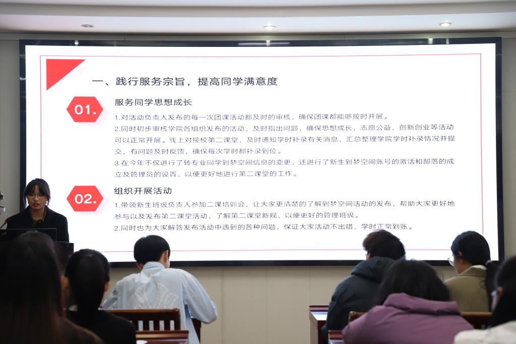 述职评议环节,学生会、交流服务中心、新媒体中心及学生社团负责人依次就“工作回顾、特色活动、深化改革、未来展望”等四个方面进行汇报述职。