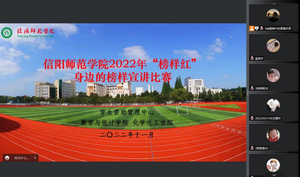 为进一步贯彻落实资助育人工作要求,全面落实国家资助政策,发挥榜样示范引领作用,学习榜样事迹、发挥榜样力量、争当榜样的浓厚氛围,进一步加大学生资助宣传力度,扩大宣传效果,2022年身边的榜样宣讲活动于11月30日以线上腾讯会议形式开展,成人在线 资助专员杨帆老师、化学化工学院资助专员赵方方老师以及两院两百余名学生参加此次会议。