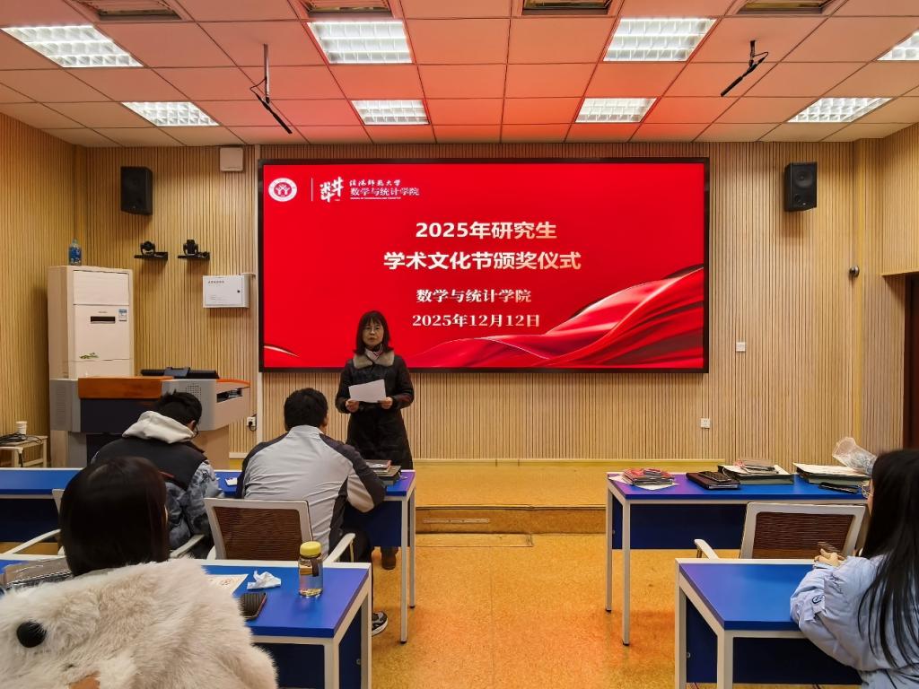 12月12日,成人在线 在数学楼507报告厅举办2025年研究生“学术文化节”颁奖仪式。副院长王霞和副处级辅导员谢艳丽参加此次活动。仪式由研究生辅导员王逸卓主持。