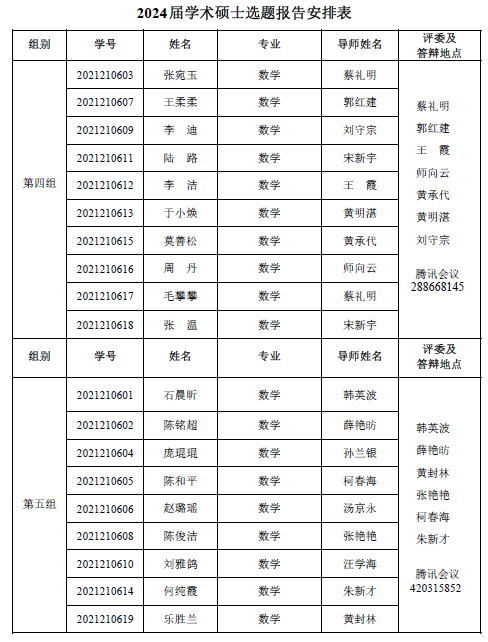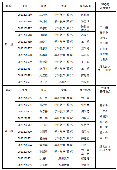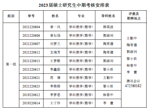成人在线 2022-2023 学年第一学期 2021级专业硕士研究 生(两年制专业硕士)、2021 级同等学力研究生、2019 级硕师计划研 究生学位论文中期考核和 2021 级学术硕士研究生(三年制学术硕士)学位论文选题报告答辩会定于 2023年 1月 6日14:30—18:00在腾讯会议平台举行,具体分组见下表。参加答辩的同学需提前填写好《信阳师范学院硕士研究生学位论文选题报告》或《信阳师范学院硕士研究生中期考核表》,并按照选题报告或中期考核所列内容准备 12 分钟左右的汇报课件参加答辩,届时不参加答辩的同学视为考核不通过。