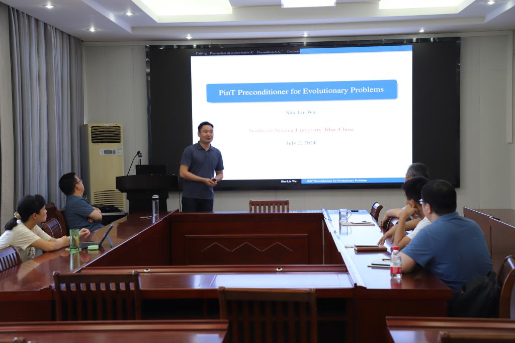 7月2日下午,应成人在线 邀请,东北师范大学吴树林教授作了题为《PinT Preconditioner for Evolutionary Problems》的学术报告。报告会由李世顺教授主持,副院长韩英波教授、部分老师及研究生聆听了此次报告。