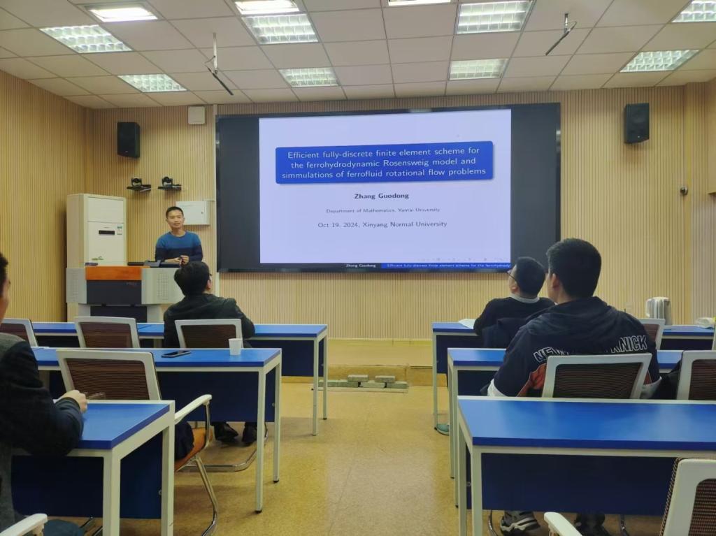 10月19日上午,应成人在线 邀请,烟台大学张国栋教授作了题为《Efficient fully-discrete finite element scheme for the ferrohydrodynamic Rosensweig model and simulations of ferrofluid rotational flow problems》的学术报告。报告会由李世顺教授主持,部分老师及研究生聆听了此次报告。