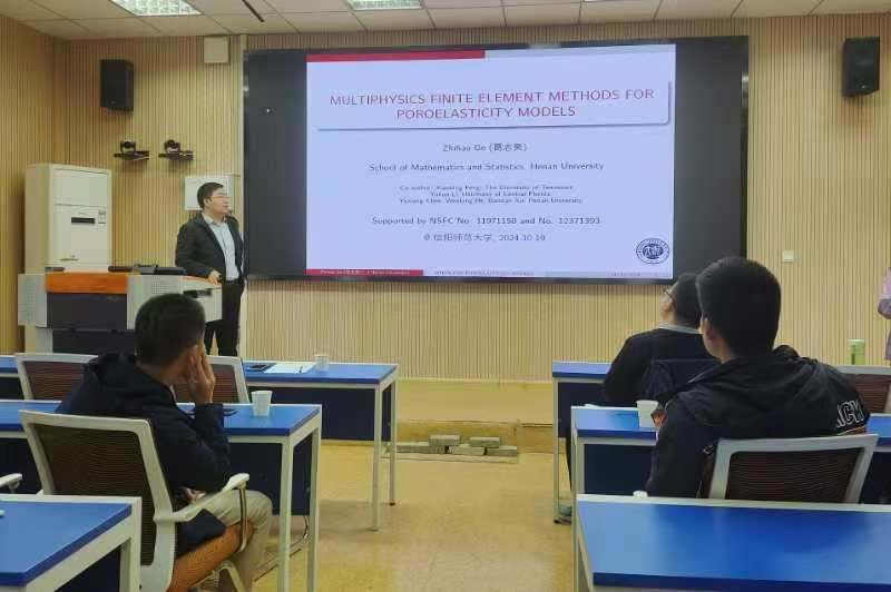10月19日上午,应成人在线 邀请,河南大学葛志昊教授作了题为《MULTIPHYSICS FINITE ELEMENT METHODS FOR POROELASTICITY MODELS》的学术报告。报告会由李世顺教授主持,部分老师及研究生聆听了此次报告。