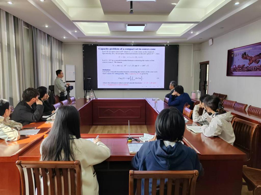 10月25日上午,应成人在线 邀请,广西师范大学尹佳斌副教授作了题为《Sharp upper bounds of $p$-capacity in convex cone and asymptotically flat half-space》的学术报告。报告会由副院长韩英波教授主持,部分教师及研究生聆听了此次报告。