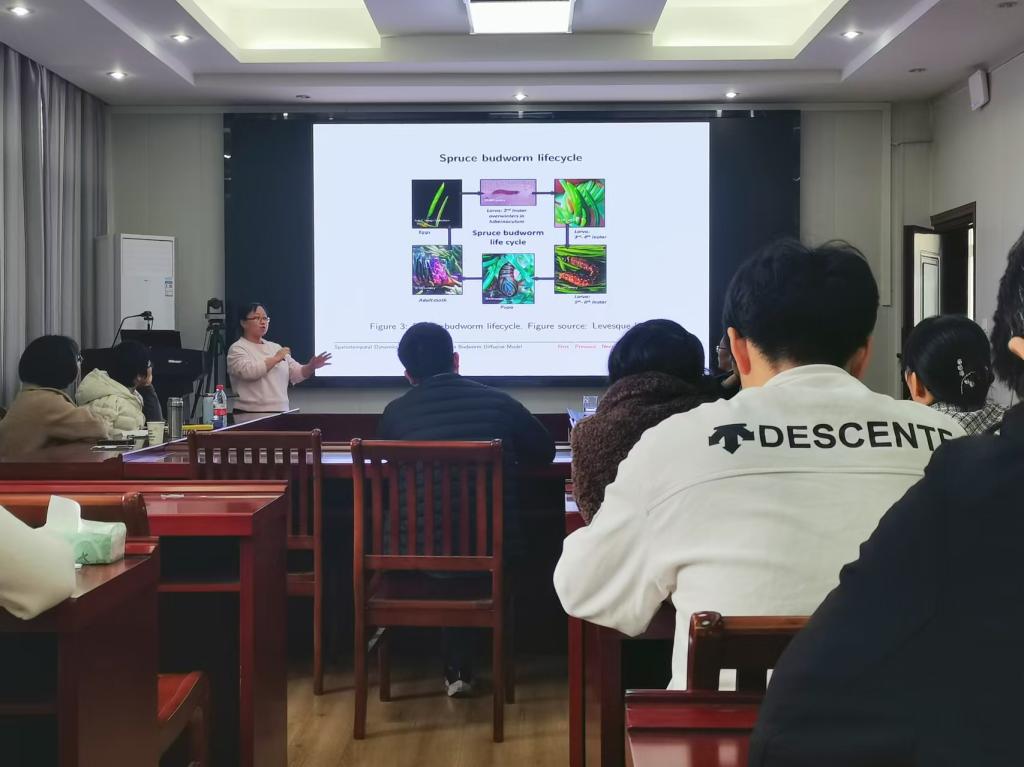 11月10日上午,应成人在线 邀请,陕西师范大学舒洪英教授在数学楼315会议室为成人在线 师生作了题为“Spatiotemporal dynamics of a structured spruce budworm diffusive model”的学术报告。报告由副院长王霞教授主持,生物数学方向的老师及研究生聆听了此次报告。