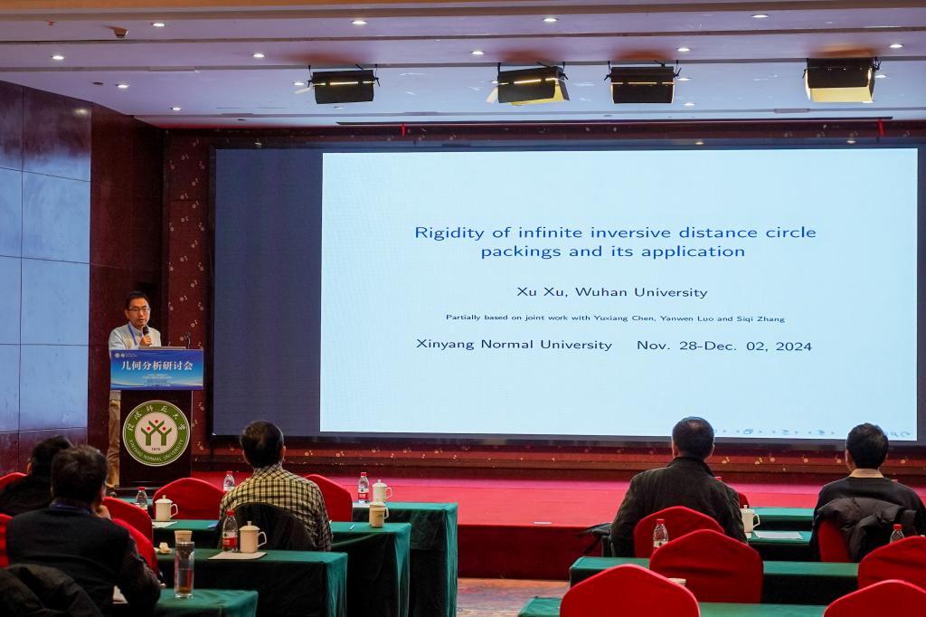 第3场学术报告是由武汉大学的徐旭教授作了题目为“Rigidity of infinite inversive distance circle packings and its application”的学术报告,此场学术报告由南昌大学的付海平教授主持。
