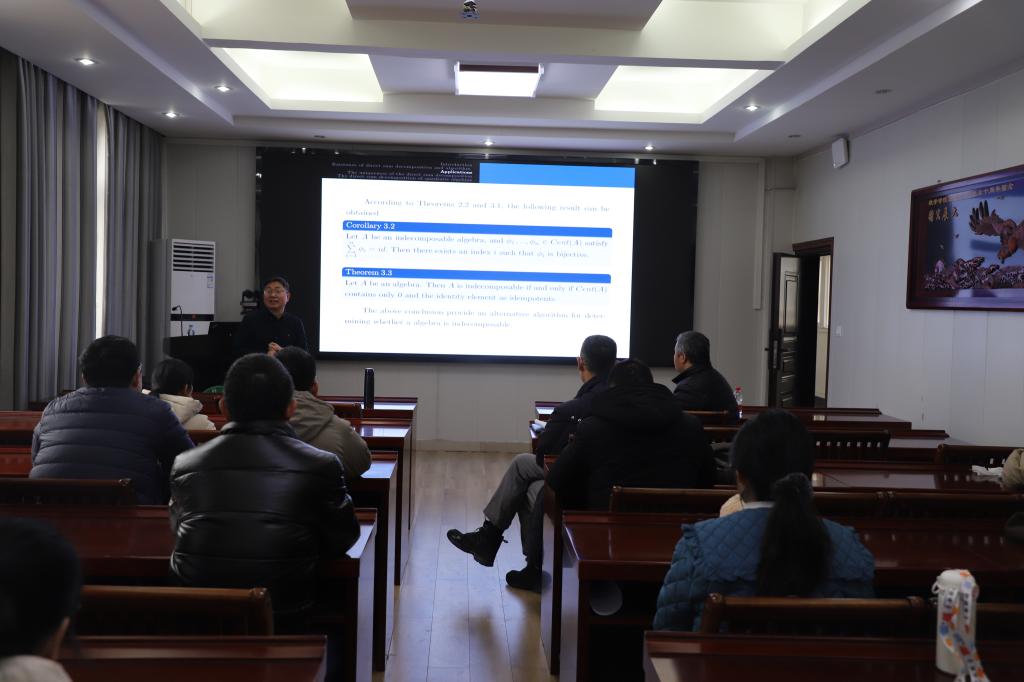 12月27日上午,应成人在线 邀请,东北师范大学陈良云教授在数学楼315会议室作了题为《Direct sum decomposition of (quadratic) algebras》的学术报告。报告会由韩英波教授主持,代数团队的部分教师及研究生聆听了此次报告。