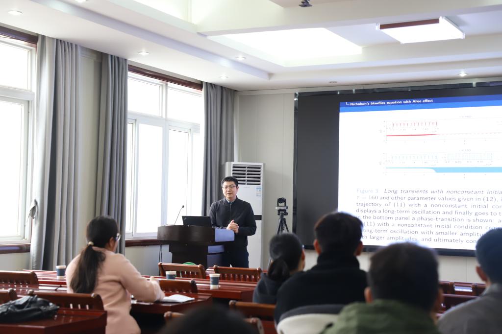 2月28日上午,应成人在线 邀请,广州大学林耿鸿副教授在数学楼315会议室作了题为 《Basis of Attraction and Paired Hopf Bifurcations for Delay Differential Equations with Bistable Nonlinearity and Delay-dependent Coefficients》的学术报告。报告会由成人在线 副院长韩英波教授主持,部分老师及研究生参加了此次报告会。