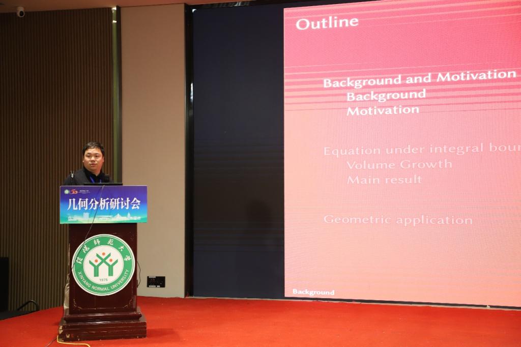 第五场报告是由中山大学袁伟教授给出,题目为《庞加莱-爱因斯坦流形上高斯-博内-陈公式的外围空间构造》,由河南师范大学黄广月教授主持。在报告中,袁教授给出了一般重整化曲率积分下一个新的高斯-博内-陈公式。特别地,得到了庞加莱-爱因斯坦流形上高斯-博内-陈公式新的表达式,统一了 Anderson、Chang-Qing-Yang、Albin 等人的结果。