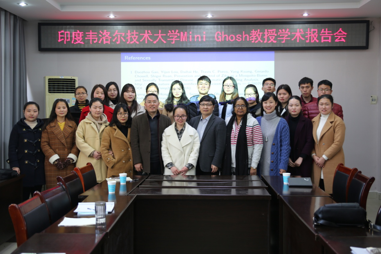 报告中,Mini Ghosh教授首先简要介绍了国际上对媒介传播疾病的研究概况,重点对Zika病毒的传播建模进行了回顾。其次,就媒体报道、信息传播等对Zika病毒传播的影响提出了新的动力学模型,并对模型的理论、数值分析等进行了讲解,报告深入浅出,具有学术前沿性。最后,河南师范大学副校长李学志教授对本场报告会进行了详细点评,进一步增强了在座师生对报告内容的理解。Mini Ghosh教授自从2007年起,一直与成人在线