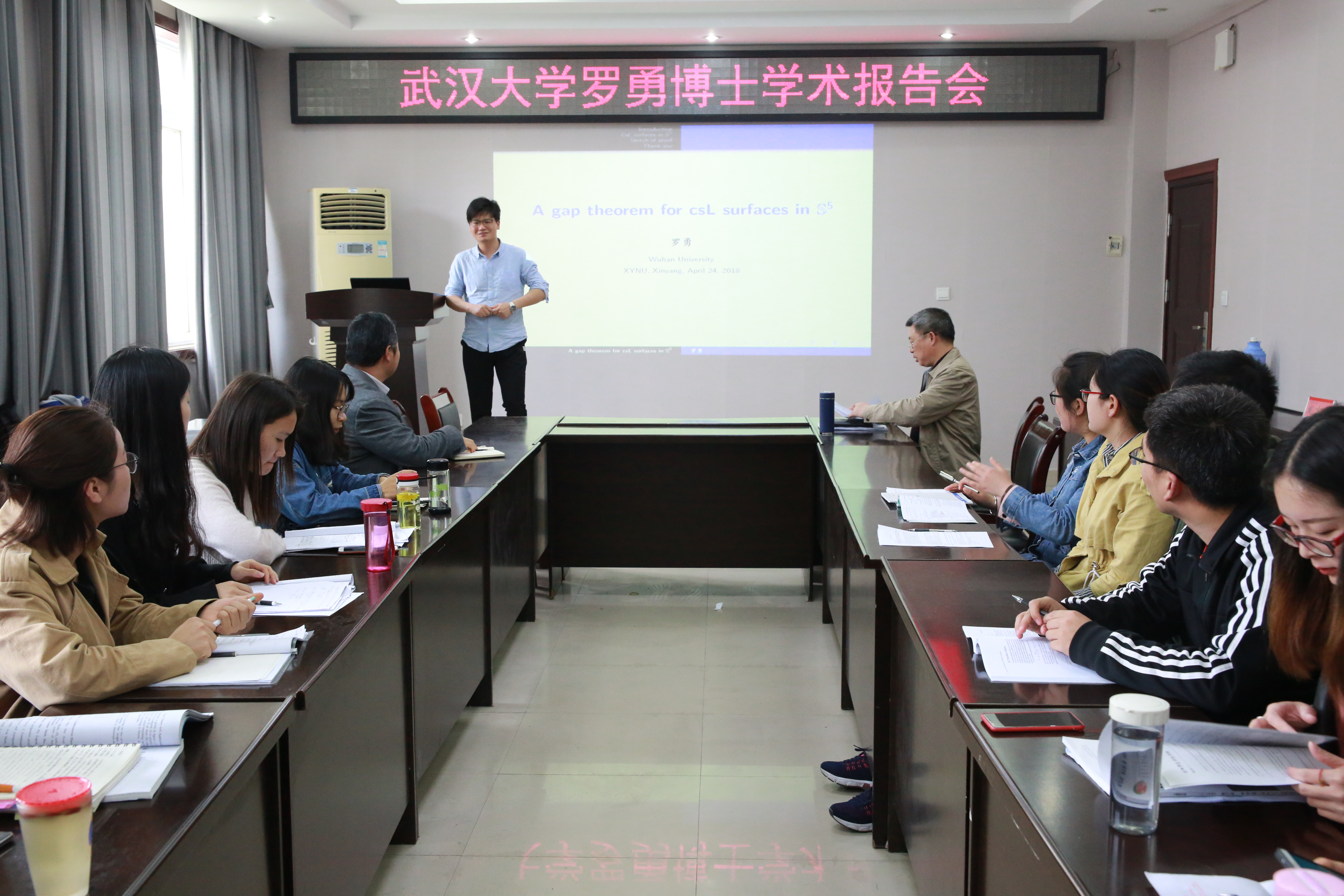 2018年4月24日下午,应成人在线 邀请,武汉大学罗勇博士在数学学院院学术报告厅作了题为“ A gap theorem for csl surfaces in five dimensional sphere”的学术报告,报告会由成人在线 院长胡余旺教授主持,该院的部分教师和研究生聆听了此次报告。