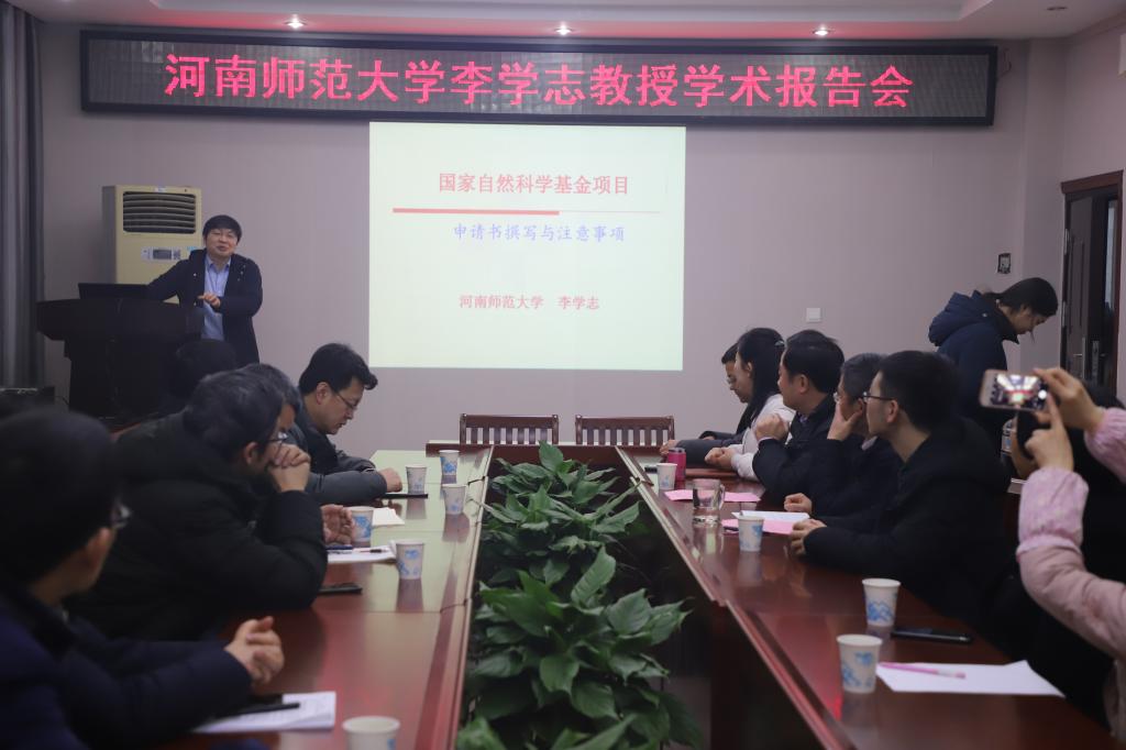 1月13日上午,应成人在线 邀请,河南师范大学副校长李学志教授在学院学术报告厅作了题为“国家自然科学基金项目申请书撰写及注意事项”的报告,报告会由科技处处长罗永松教授主持,成人在线 申报2020年国家自然科学基金的老师和部分研究生聆听了此次报告。