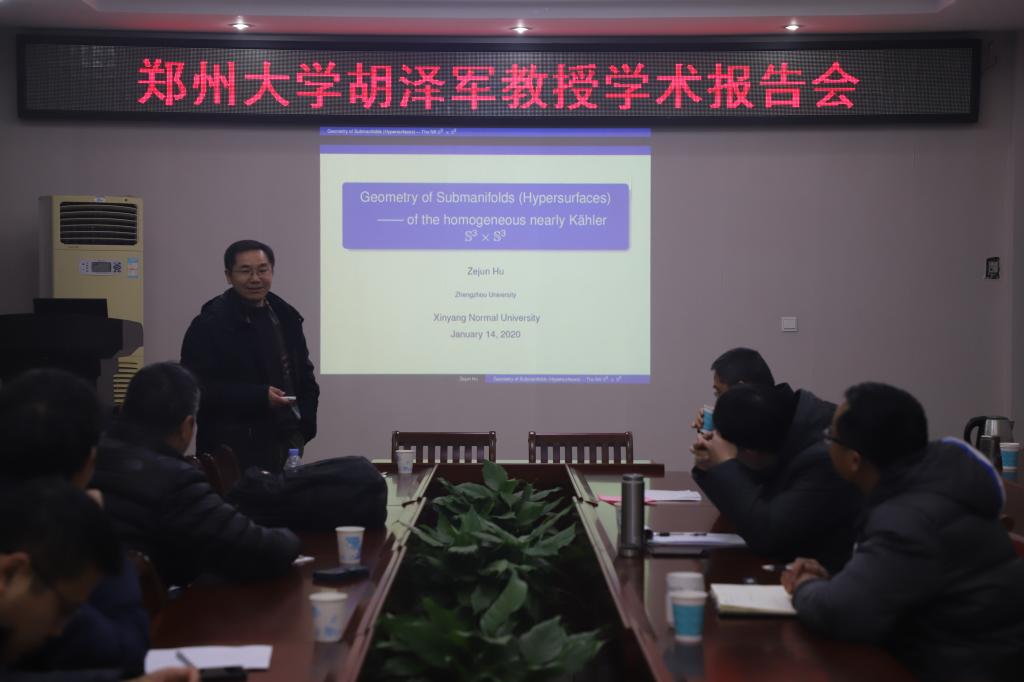 1月14日上午,应成人在线 邀请,郑州大学胡泽军教授和郭向前教授在学院学术报告厅分别作了题为“Geometry of submanifolds in the nearly Kaehler”和“A class of sld+1 modules from Witt algebra modules”的学术报告,报告会由成人在线 副院长蔡礼明教授主持,学院部分老师和研究生聆听了此次报告。