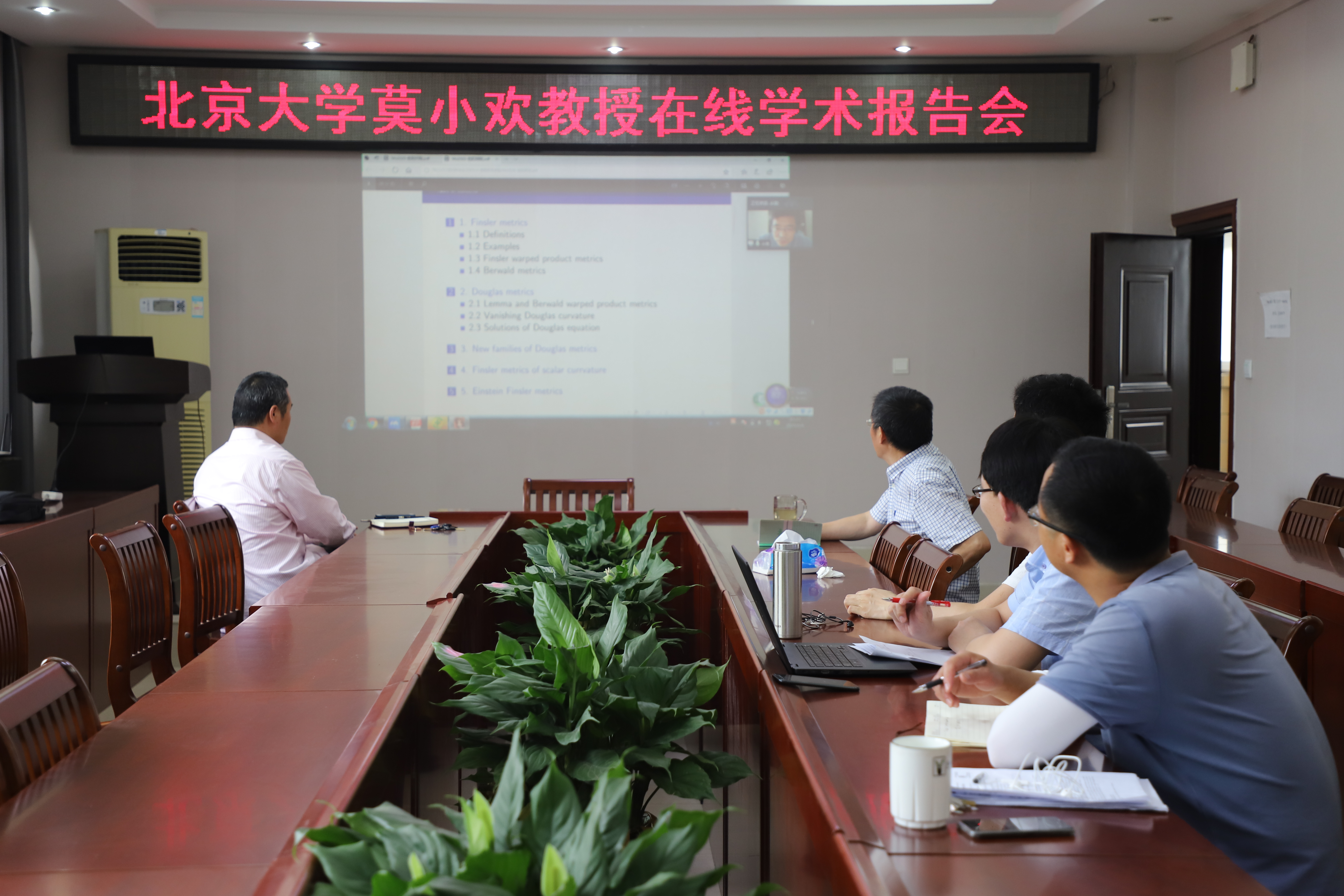 6月6日,北京大学莫小欢教授应成人在线 邀请,通过腾讯会议平台为学院师生做了题为“Finsler warped product metrics”的学术报告。报告会由成人在线 副院长蔡礼明教授主持,学院部分老师和研究生聆听了此次报告。