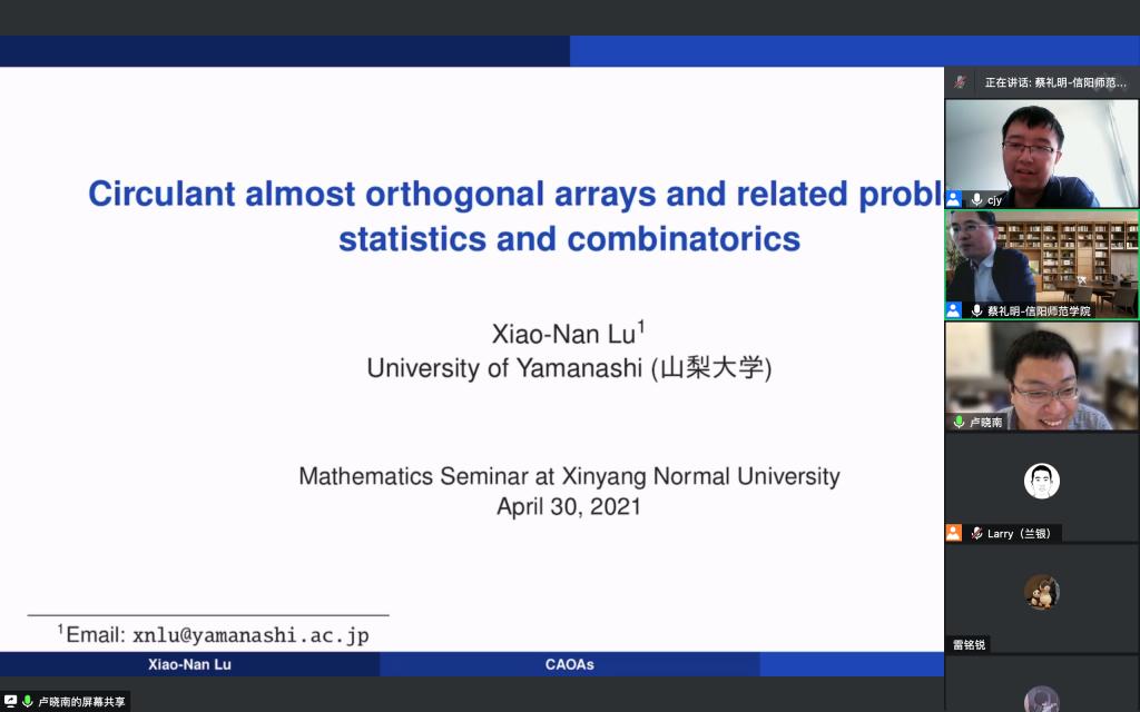 4月30日下午,应成人在线 邀请,日本山梨大学卢晓南博士通过腾讯会议平台做了一场题为《Circulant almost orthogonal arrays and related problems in statistics and combinatorics》的在线学术报告。报告会由成人在线 副院长蔡礼明教授主持,学院部分老师和研究生聆听了此次报告。