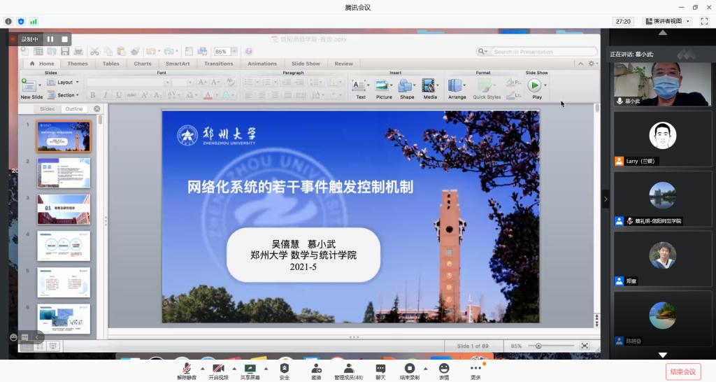 5月17日上午,应成人在线 邀请,郑州大学慕小武教授通过腾讯会议平台做了一场题为《网络化系统的若干事件触发控制》的在线学术报告。报告会由成人在线 党委书记王娟主持,学院部分老师和研究生聆听了此次报告。