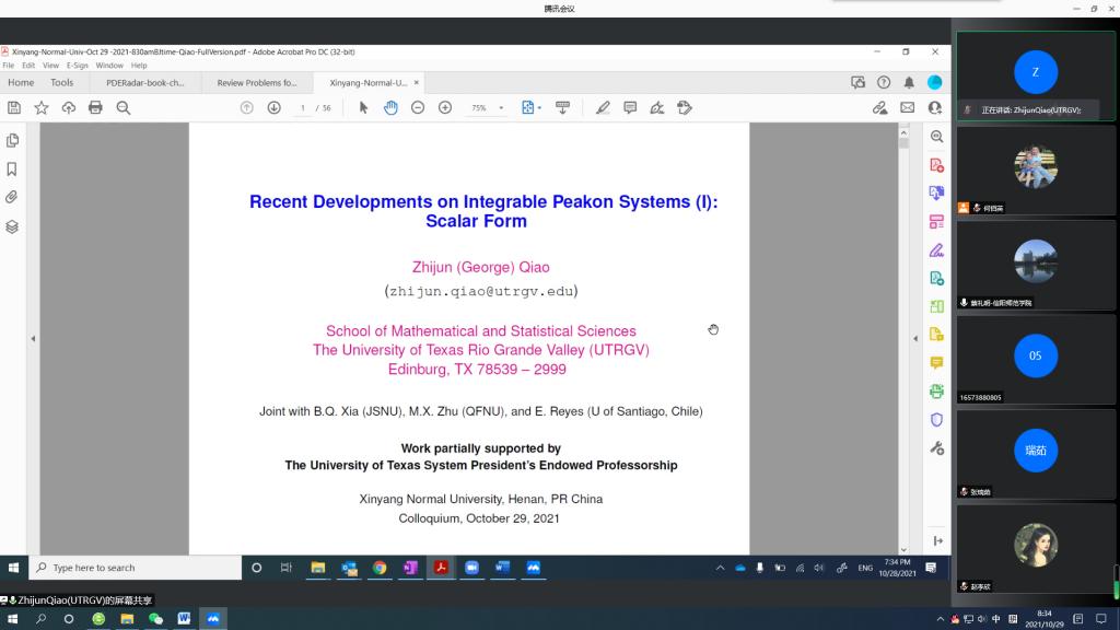 10月29日上午,应成人在线 邀请,美国德克萨斯大学乔志军教授通过腾讯会议平台为成人在线 研究生及相关研究方向老师作了题为《Recent Developments on Integrable Peakon Systems》的学术报告。报告会由成人在线 院长蔡礼明教授主持。