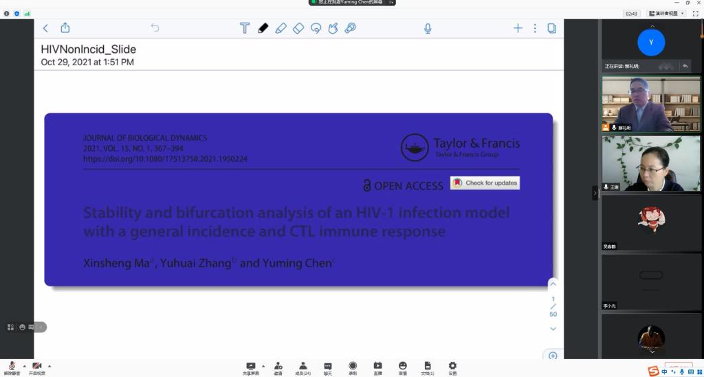 10月30日上午,应成人在线 邀请,加拿大罗瑞尔大学陈玉明教授通过腾讯会议平台为成人在线 研究生及相关研究方向老师作了题为《Stability and bifurcation analysis of an HIV-1 infection model with a general incidence and CTL immune response》的学术报告。报告会由成人在线 院长蔡礼明教授主持。