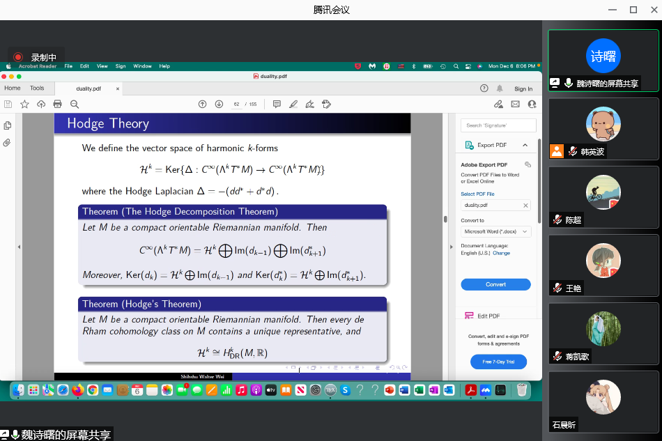 12月7日上午,应成人在线 邀请,美国俄克拉荷马大学魏诗曙教授通过腾讯会议平台在线作了题为《Unifications of dualities in mathematics from tradition to contemporary with a harmonic viewpoint》的学术报告,学院部分老师和研究生聆听了此次报告。报告会由成人在线 副院长韩英波教授主持。