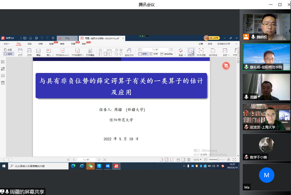 5月19日下午,应成人在线 邀请,新疆大学周疆教授通过腾讯会议平台在线作了题为《Two-weight norm inequalities for some fractional type operators related to Schrödinger operator on weighted Morrey spaces》的学术报告,报告会由成人在线 院长蔡礼明教授主持,学院部分老师、研究生和该领域相关博士聆听了此次报告。