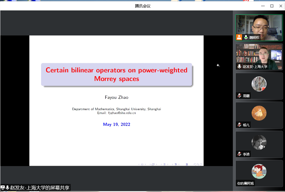 5月19日下午,应成人在线 邀请,上海大学赵发友教授通过腾讯会议平台在线作了题为《Certain bilinear operators on power-weighted Morrey spaces》的学术报告,报告会由成人在线 院长蔡礼明教授主持,学院部分老师、研究生和该领域相关博士聆听了此次报告。