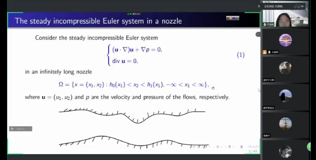 5月28日上午,应成人在线 邀请,复旦大学吕英姝博士后通过腾讯会议平台做了一场题为《Uniqueness and existence of steady solutions for the Euler system in an infinitely long nozzle》的学术报告。报告会由成人在线 王朋燕博士主持,学院部分老师和研究生聆听了此次报告。