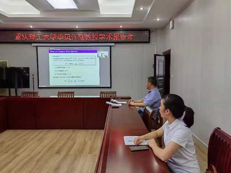 7月28日上午,应成人在线 邀请,重庆理工大学李凤江副教授通过腾讯会议平台做了一场题为《Rigidity of Complete Gradient Steady Ricci Solitons with Harmonic Weyl Curvature》的学术报告。副院长韩英波和学院部分教师在315会议室及腾讯会议平台聆听了此次报告。报告会由副院长韩英波教授主持。