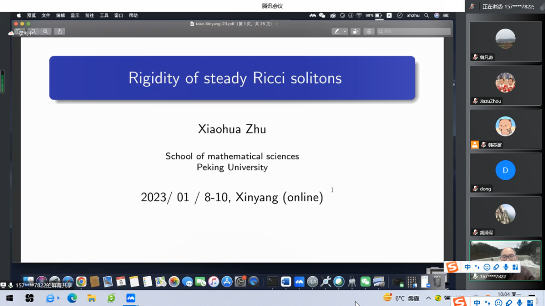 第2场报告由北京大学朱小华教授报告,题目为《Rigidity of steady Ricci solitons》。在报告中,朱小华教授通过引进比正截面曲率或迷向曲率更弱的新的拼挤条件,得到了Bryant Ricci soliton的一些刚性结果。