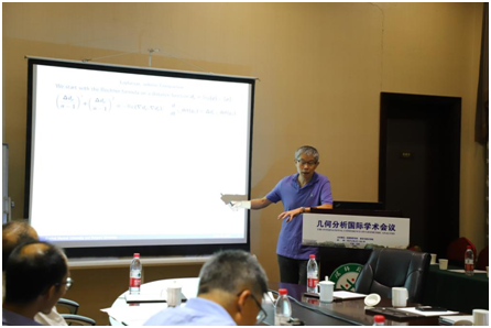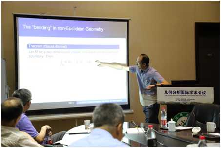 第2场报告由纽约市立大学李楠副教授报告,题目为《Curvature measure on spaces with lower curvature bounds》。在报告中,李楠副教授主要讨论了他在关于曲率度量收敛性的Naber 猜想上的一些重要进展。