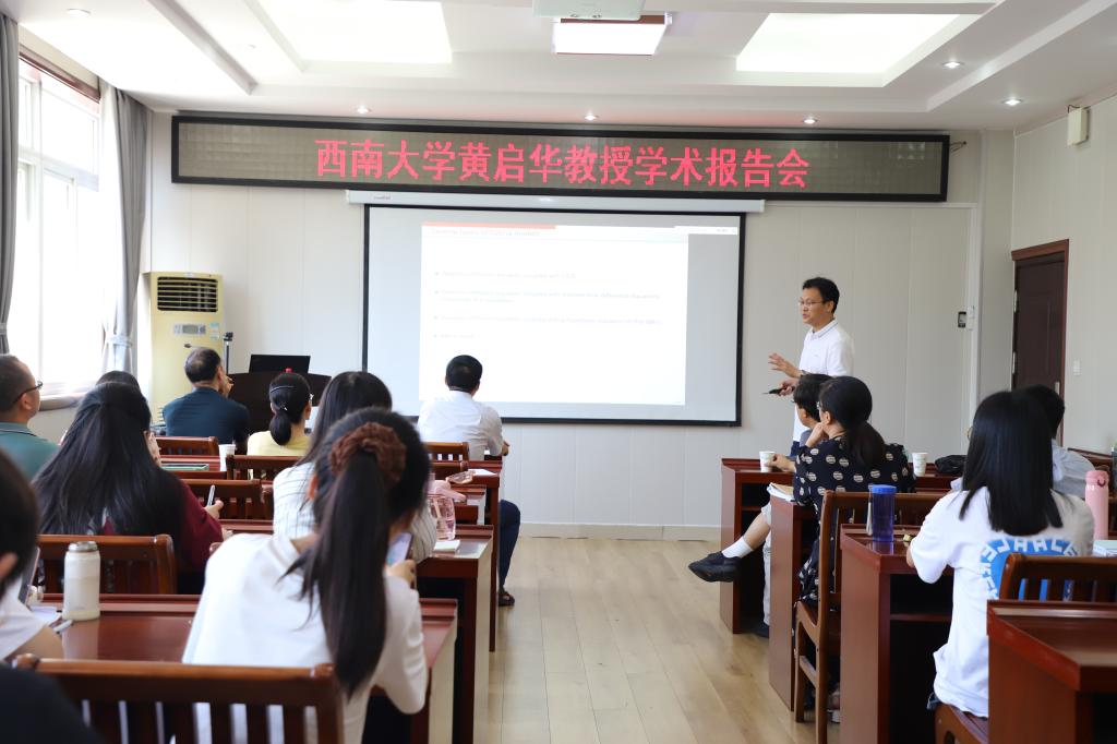 8月2日上午, 西南大学黄启华教授在学院报告厅315作了题为“A hybrid parabolic and hyperbolic equation model for a population with separate dispersal and stationary stages: well-posedness and population persistence”的学术报告,报告会由成人在线 院长蔡礼明教授主持,学院生物数学方向教师和研究生参加了此次报告会。