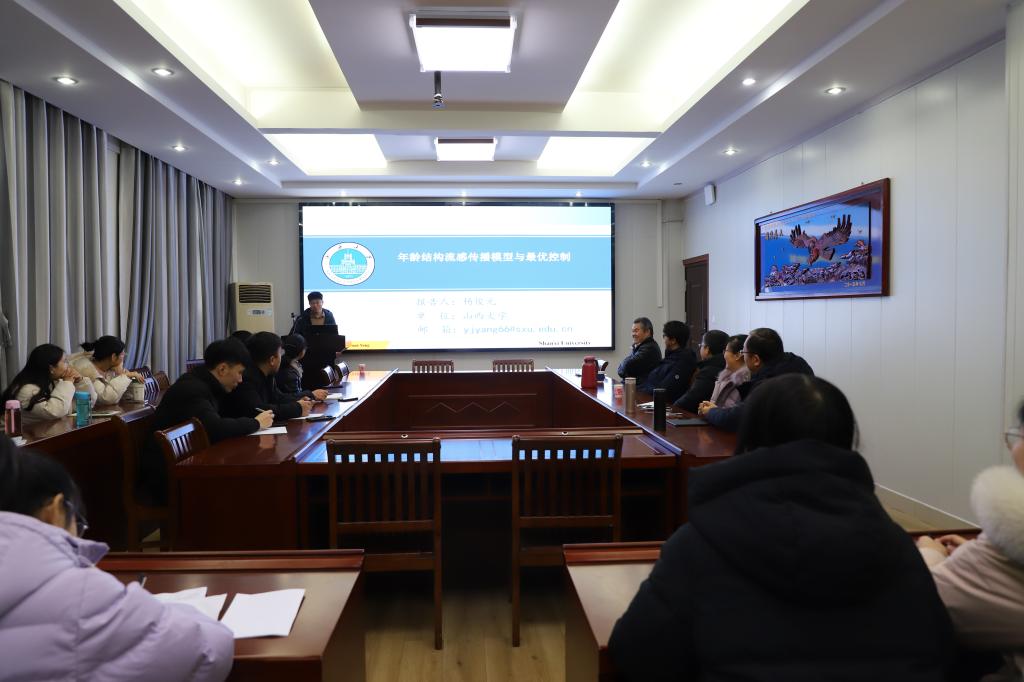 12月15日,应成人在线 邀请,山西大学杨俊元教授在数学楼315会议室做了题为 “Optimal strategies of the age-specific vaccination and antiviral treatment against influenza” 的学术报告。院长蔡礼明教授、副院长韩英波教授参加了报告会。报告会由成人在线 王霞教授主持,部分教师和研究生聆听此次报告会。