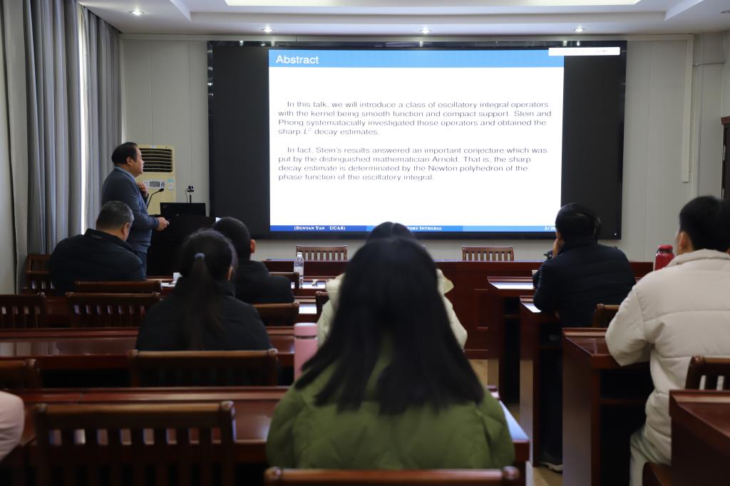 1月8日上午,应成人在线 邀请,中国科学院大学燕敦验教授在数学楼315会议室做了题为《Oscillatory Integral and Newton Polyhedron》的学术报告。报告会由院长蔡礼明教授主持,副院长韩英波教授、部分老师及研究生聆听了此次报告。