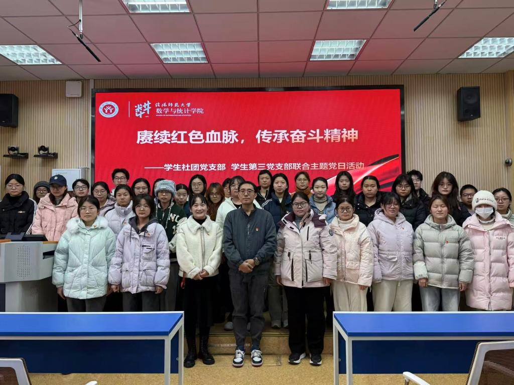12月2日,成人在线 学生社团党支部和学生第三党支部联合开展以“赓续红色血脉,传承奋斗精神”为主题的党日活动,活动在数学院517教室举行,学生社团党支部书记吴成熙,学生第三党支部书记刘红及支部全体党员参加。