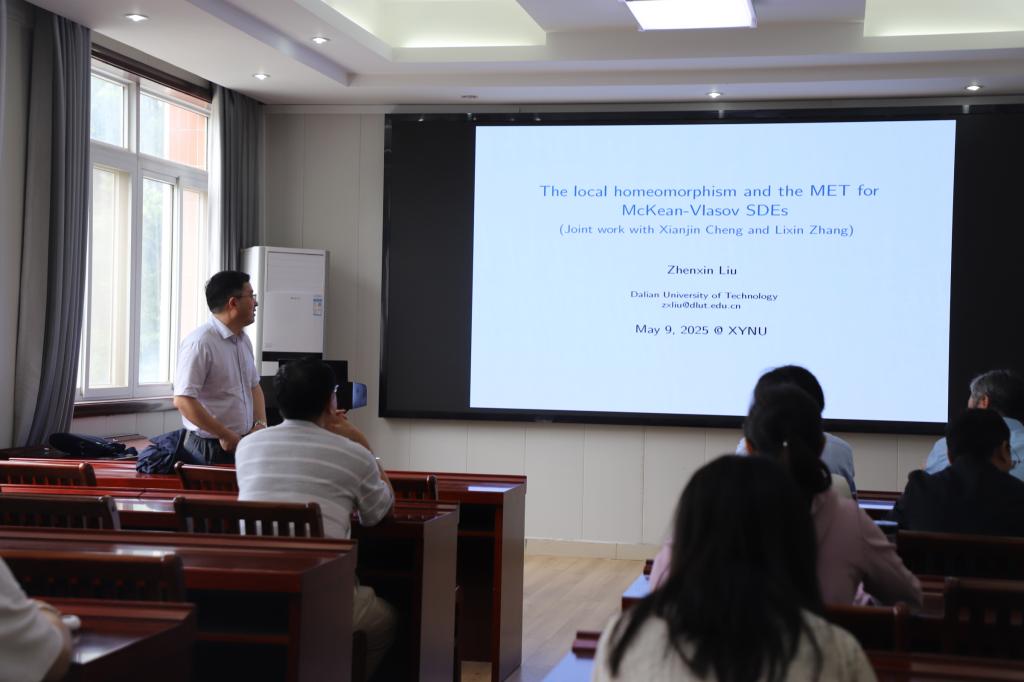5月9日上午,应成人在线 邀请,大连理工大学柳振鑫教授在数学楼315会议室作了题为 《The locally homeomorphism property and the multiplicative ergodic theorem for McKean-Vlasov SDEs》的学术报告。报告会由成人在线 院长蔡礼明教授主持,部分教师及研究生参加了此次报告会。