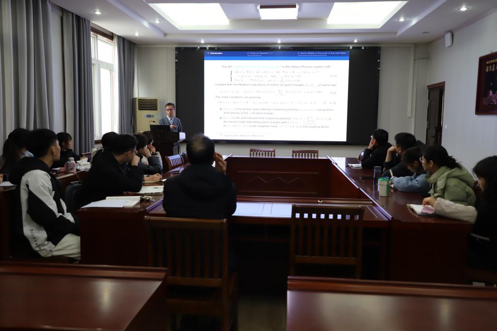 12月1日下午,应成人在线 邀请,华中科技大学张显文教授在成人在线 315会议室做了一场题为“Moment propagation of the plasma-charge model with a time-varying magnetic field”的学术报告。报告会由成人在线 院长蔡礼明教授主持,部分老师和研究生聆听了此次报告。