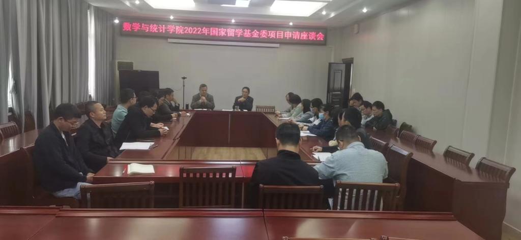在数学楼315会议室召开2022年国家留学基金委项目申请座谈会,院长蔡礼明,副院长陈越奋和2022年项目计划申请人员参会,会议由副院长韩英波主持。