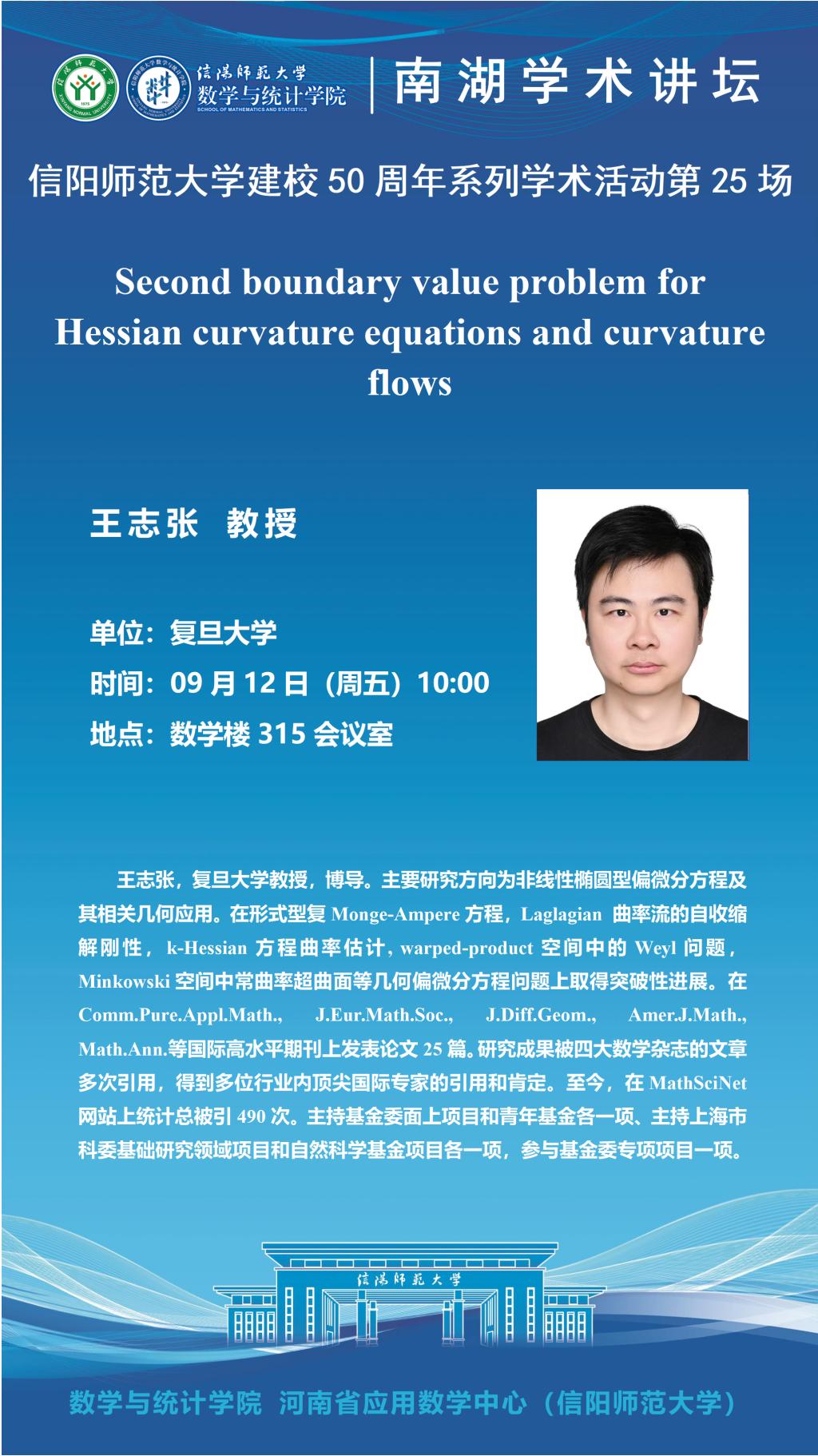 庆建校50周年之南湖讲坛:复旦大学王志张教授——Second boundary value problem for Hessian curvature equations and curvature flows