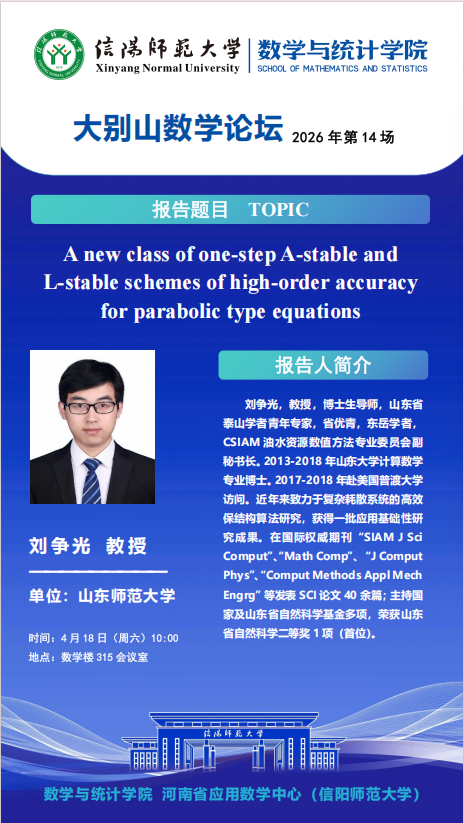 大别山数学论坛:山东师范大学刘争光教授——A new class of one-step A-stable and L-stable schemes of high-order accuracy for parabolic type equations