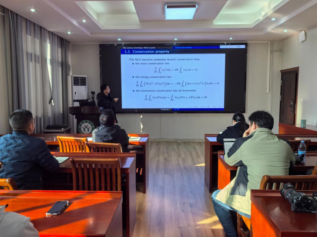 在本次报告中,李教授重点针对非线性薛定谔方程,提出了一种新的高阶保结构算法。首先,以信号在光纤中传播失真等实际问题的处理为背景,阐述了该研究的重要性,并介绍目前常用的保结构算法的优缺点。随后,李教授从能量变化得到的控制方程出发,通过将多重松弛思想应用于不同的龙格-库塔方法,发展出可适用于保持多个量不变的新型快速算法,并对方法的适定性和保结构性进行了讨论。最后,数值试验表明多重松弛龙格-库塔方法可以在时间上达到高阶精度,并在离散水平上保持多个量的守恒,展示了所提出方法的有效性和效率。
